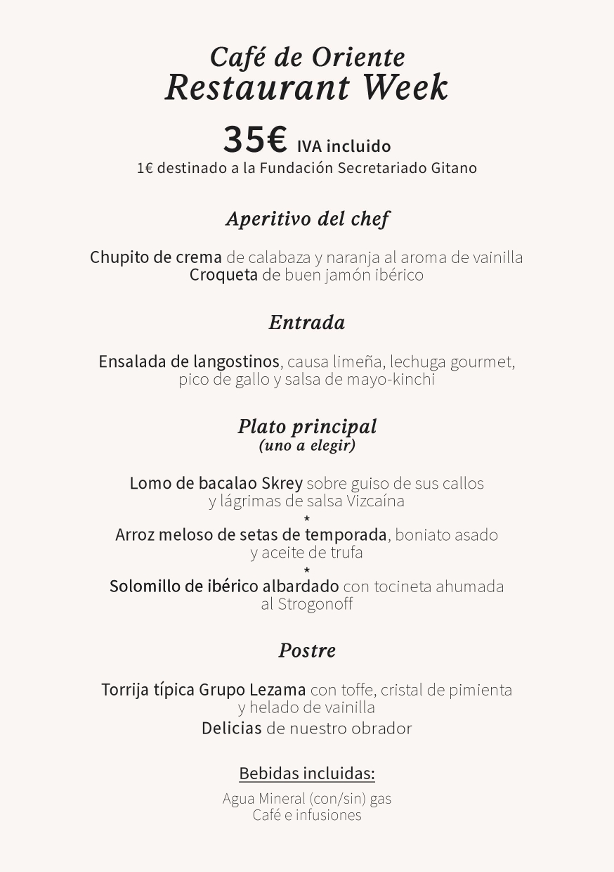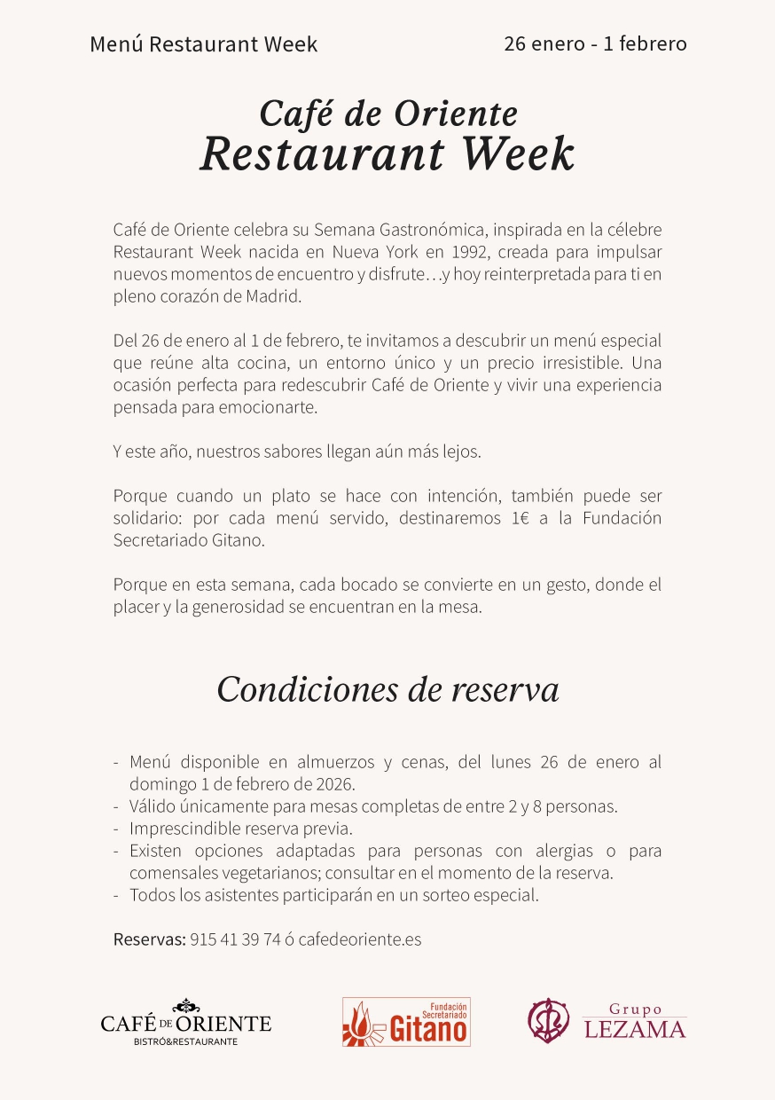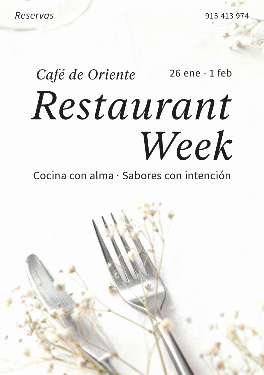 Del 26 de enero al 1 de febrero, te invitamos a descubrir un menú especial que reúne alta cocina, un entorno único y un precio irresistible. Una ocasión perfecta para redescubrir Café de Oriente y vivir una experiencia pensada para emocionarte.