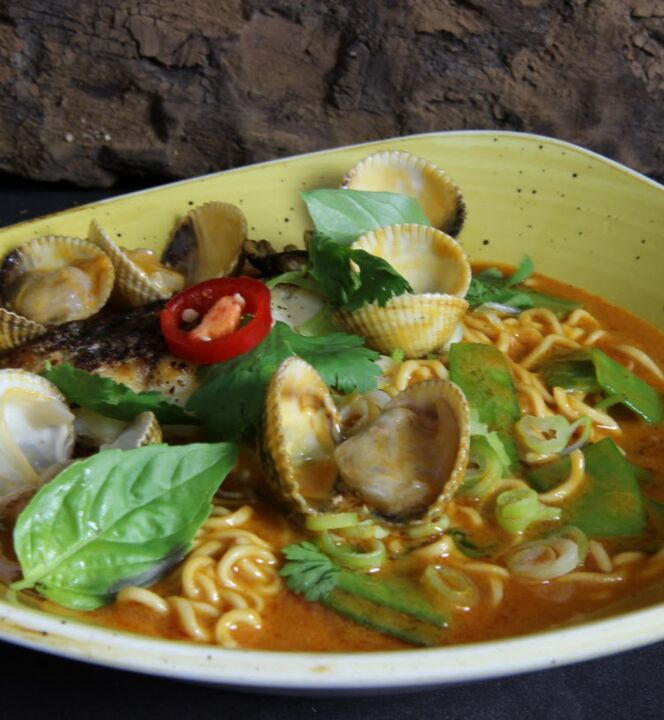 ligero picante (soy bastante sensible al picante, mis amigas no lo notaron apenas), pero muy bueno todo. Lo que más picó fue el curry verde, a tener en cuenta por los que no quieren picante. Pusieron de aperitivo una cena de calabaza deliciosa. Imperdible el tartar de vieiras y el bao. Para repetir mil veces!