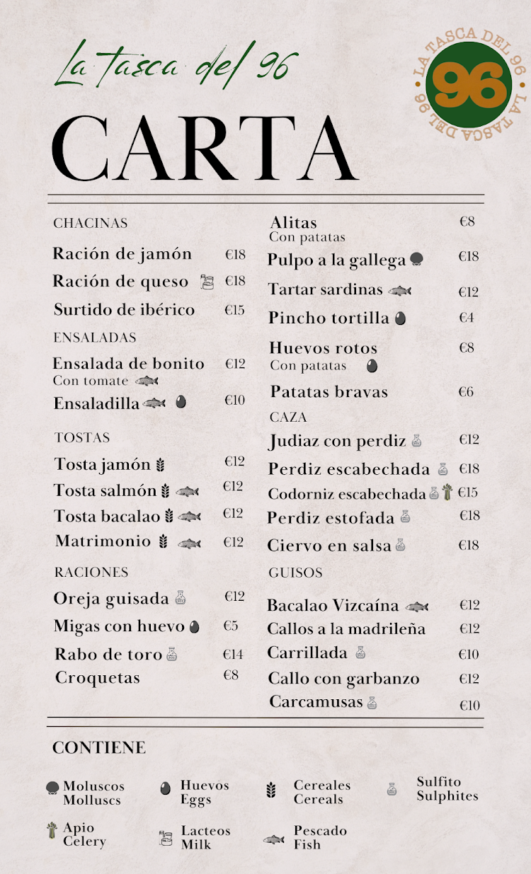Con un servicio atento y una atmósfera que invita a la conversación, La Tasca del 96 se presenta como un lugar ideal para disfrutar de la gastronomía española en buena compañía.