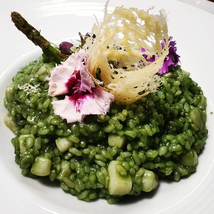 Pedimos lentejas, risotto (buenísimo) y lubina ya que era el pescado del día. De postre un bienmesabe 👌🏽.