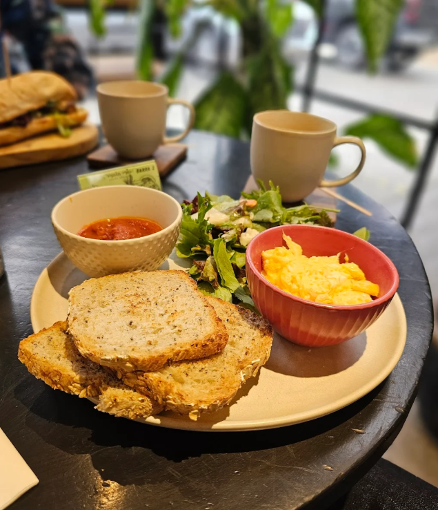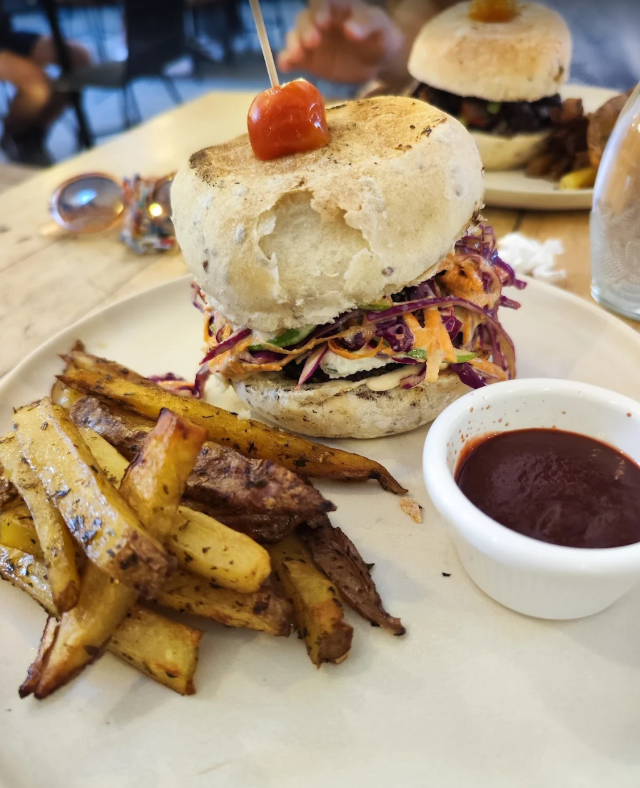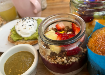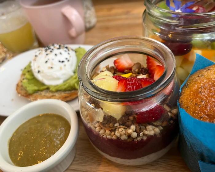 El lugar es lindo, lleno de plantas y muy acogedor. La carta es especializada en desayunos/brunch pero tienen también platos de almuerzo/cena y cocktails. Hay muchísimas opciones veganas y vegetarianas y me encantó que tuvieran un menú para perritos.