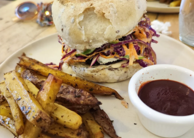 Entiendo que el concepto del lugar es de comida ‘sana’ pero los platos que pedimos me parecieron medios desabridos (y el «ketchup casero» horrible), así que por eso le bajo la nota.